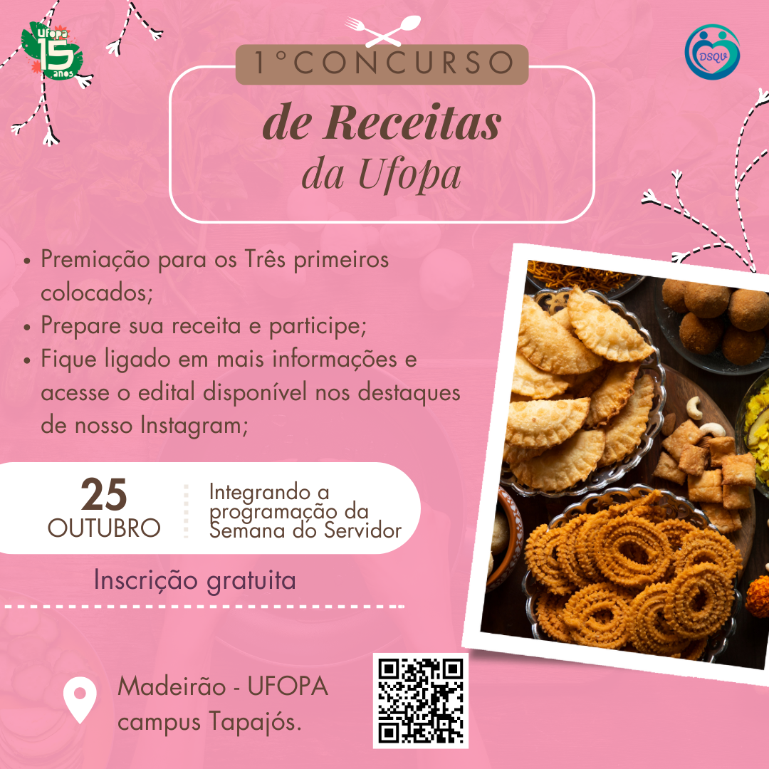 As inscrições para o 1º Concurso Culinário "Petiscando na UFOPA" serão realizadas exclusivamente por meio do formulário eletrônico disponível no link https://forms.gle/rwyyVL63Q9kE91889 ou através do QR code divulgado nas publicações do Instagram da DSQV. É obrigatório que os participantes, que devem ser servidores ativos ou aposentados da Universidade, apresentem uma descrição completa e detalhada da receita que será apresentada no concurso. Cada participante poderá realizar apenas uma inscrição.