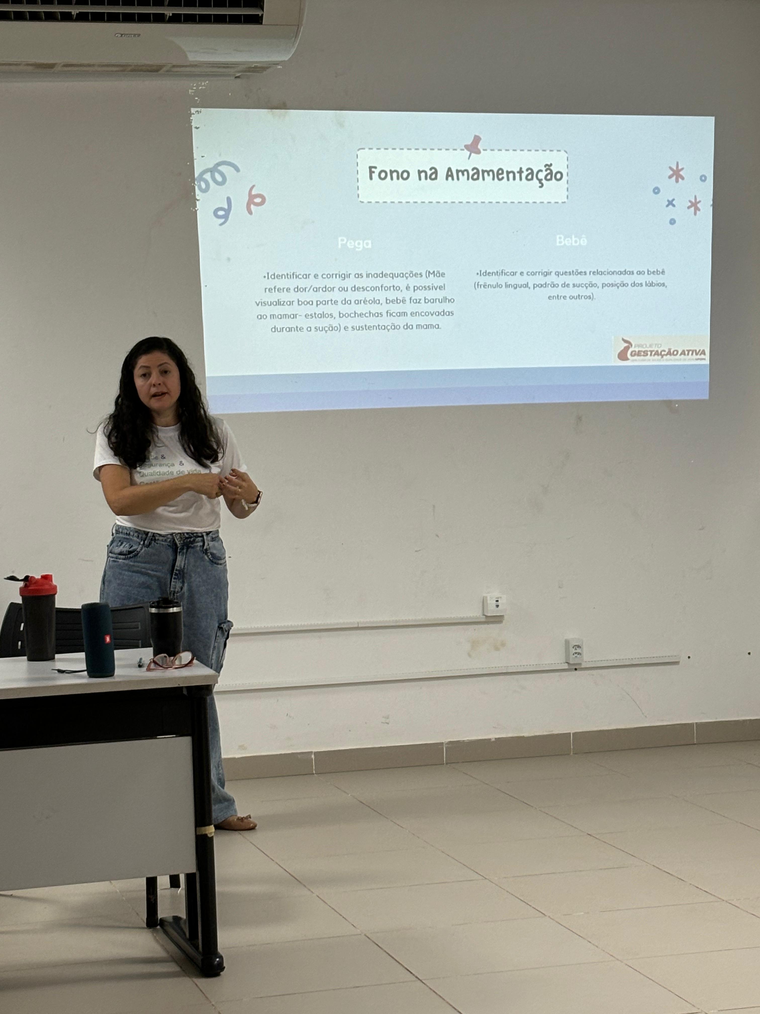 A programação contou com a parceria do projeto de extensão Nascer em Santarém, vinculado a Clínica de Direitos Humanos do curso de Direito da UFOPA, a Docente Coordenadora Lidiane Leão, e as discentes Juliana Batista e Yasmin da Costa, abordaram temáticas acerca da violência obstétrica, plano de parto e o aleitamento materno em público. Em seguida a fisioterapeuta Marissol Almeida, realizou um momento para alongamento com as participantes, bem como repassou orientações acerca de respirações e exercícios que auxiliam durante a gestação. A enfermeira da DSQV, Francimara Barreto, abordou sobre a importância da amamentação e os procedimentos neonatais como o teste do pezinho, teste do coraçãozinho e entre outros, informando a respeito da importância de cada procedimento, onde ele é ofertado e o período correto para suas realizações. Ainda, a Fonoaudióloga Daniely Martins, trouxe as temáticas do Teste da Linguinha e do Teste da Orelhinha para a roda, destacando sua importância para a realidade neonatal.
