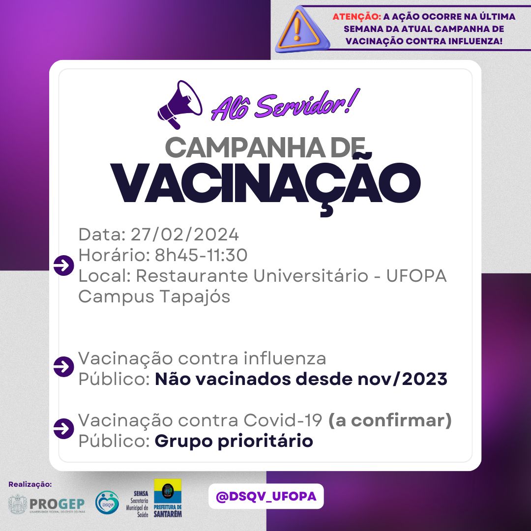 A Progep, por meio da DSQV, aguarda confirmação, sobre a possibilidade de nessa oportunidade vacinar também o público prioritário para Covid-19. Aguarde maiores informações.