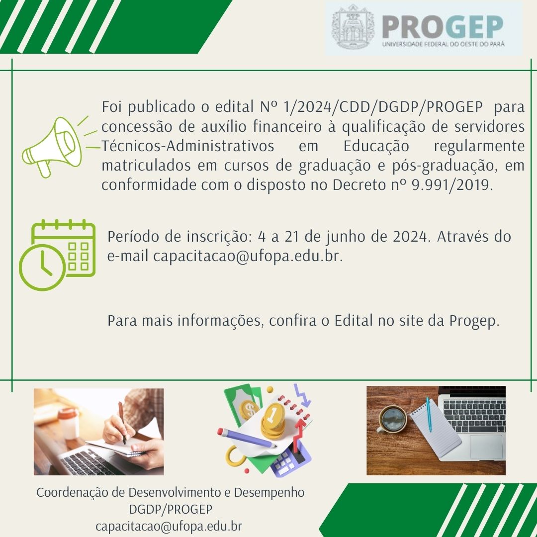 A Pró-reitoria de Gestão de Pessoas (Progep), por meio da Coordenação de Desempenho e Desenvolvimento (CDD), publicou um edital que concede auxílio financeiro a servidores Técnicos Administrativos em Educação matriculados em cursos de graduação e pós-graduação, em conformidade com o Decreto nº 9.991/2019. O edital visa promover o desenvolvimento dos servidores técnico-administrativos em educação da Ufopa através de iniciativas de apoio à educação formal, estimulando sua capacidade crítica e reflexiva e buscando o aprimoramento de seu desempenho para alcançar os objetivos institucionais.