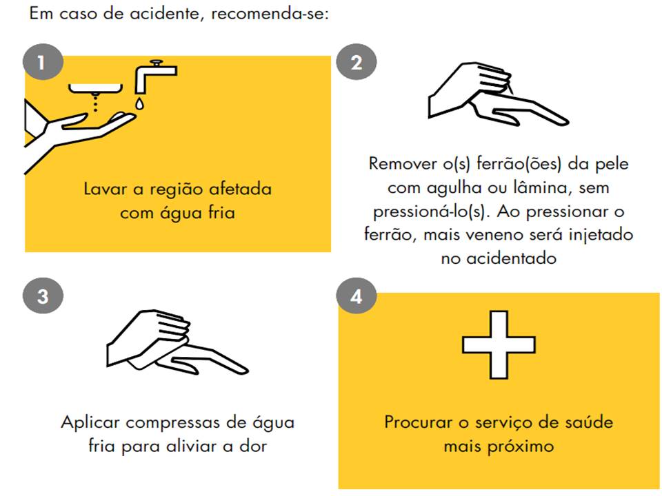 Cabe salientar que, ao se dirigir ao atendimento médico, sempre que possível, leve exemplares dos insetos que provocaram o acidente.